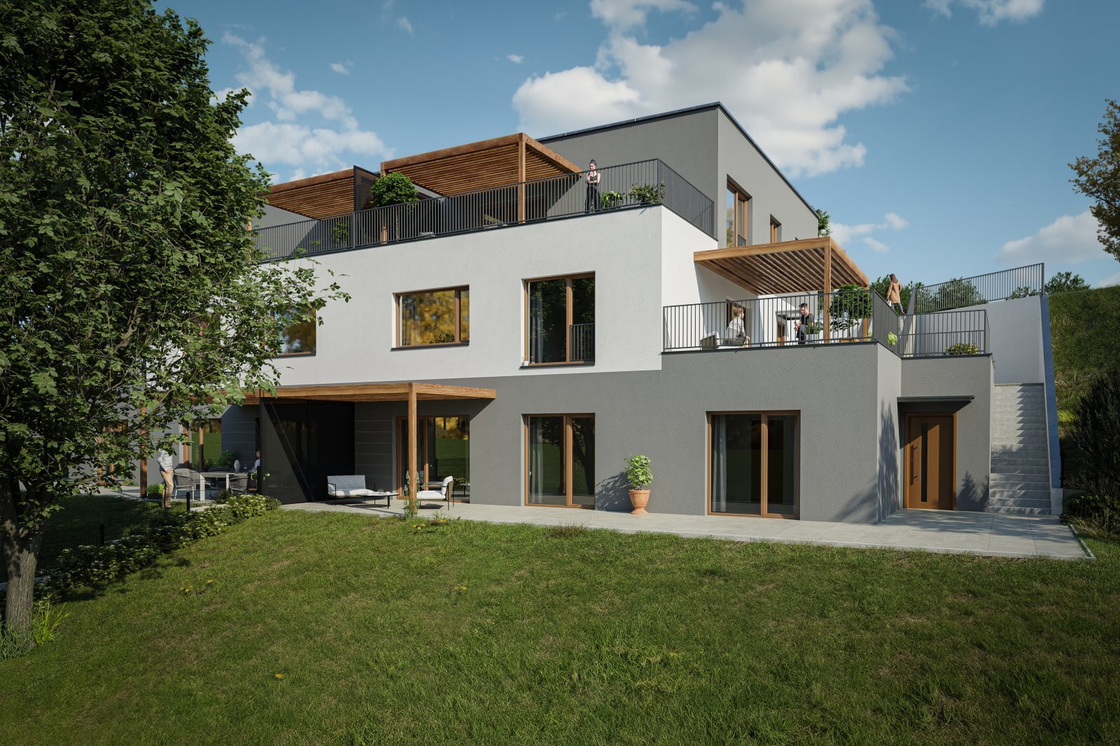 Jedná se o horní byt v 1. nadzemním podlaží. Byt disponuje prostornou terasou o výměře 30 metrů, která je částečně zastřešena pergolou.